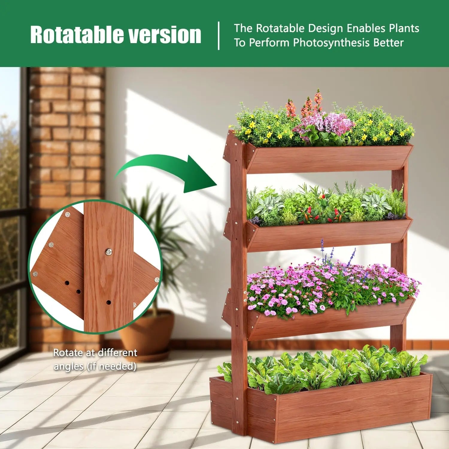 - Vertical four-tier design lets you plant vegetables, herbs, flowers, and fruits on separate levels, maximizing growing space without root competition.